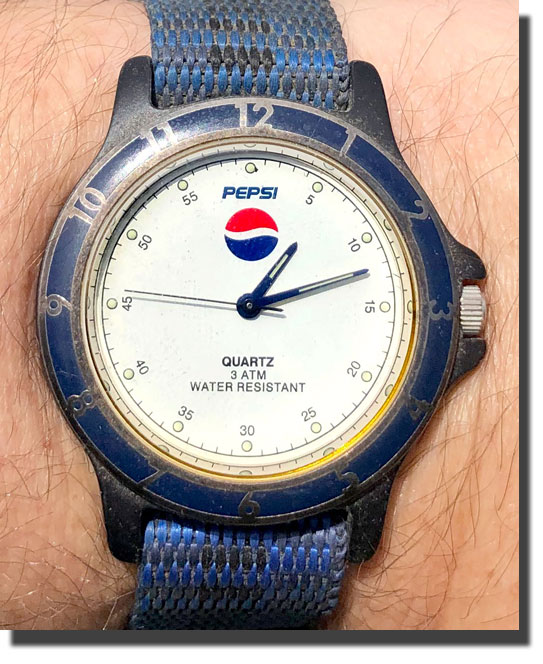 In the late 1990s Pepsi had a big Pepsi-Points promotion going, and you could get branded merchandise. I wanted this watch. It looks better in real life than it does in the photo. Big, clean dial and a pretty blue. If I ever get a new band for it, I'll start wearing it again.