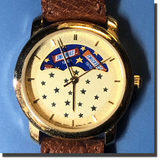 Snickers had a promotion and I sent away for this. I thought it was great because it has a moon-dial with the different snickers wrapper designs over the years. It's a little smaller than I would like, but my only real problem with it is that it takes an oddball battery.