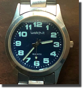 Another basic flea-market watch. Nice, navy blue dial face with easy-to-read arabic numerals and illuminated hands. Weighs almost nothing, so it feels "cheap." Sometimes having a little heft in things (appropriate to size) makes them feel like they're better quality.