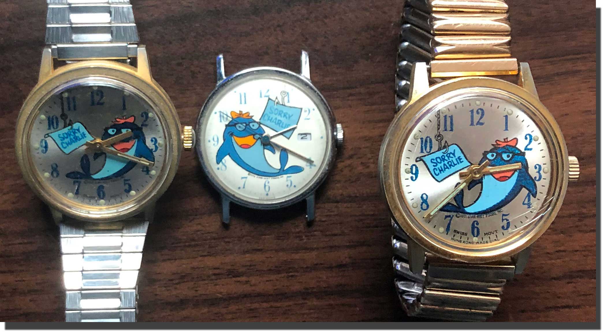 One of these is a wristwatch I wore as a little kid, but I don't remember which (I know it didn't have a date). My father was pressed from time to time to keep it running, so I now have one that's dead and another parts-donor somewhere. The non-date version is a 1-jewel Swiss movements with no name that I could find. The date version in the center, according to someone on the internet, is a Timex movement.