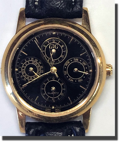 A very pretty, mid-size, gold chronometer-like watch. It has four sub-dials, one for day (3-o'clock), one for date (9 o'clock), I believe 12 o'clock is for a second time zone, and I don't recall what the other does.