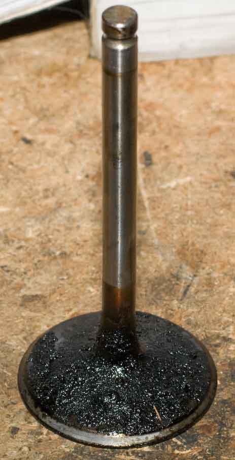 Here's my intake valve, extracted and sitting on my bench. I'll be honest and admit I can't remember which, but I believe it was the intake valve that was bent. You have to look hard (the picture doesn't do it) to see the arc in the shaft. Not enough to keep it completely from going in and out of the sleeve, but enough to impede its movement. I don't know when it was damaged. I may have done it when I had the head out the first time. I may have done it when I was putting it back on the block. Or, because it came from a junkyard engine, it may have been bent when I bought it. The engine had relatively few miles on it. It's possible the valve got bent somehow, the engine lost compression on #5. The owner took it in to find out what was the problem, and then balked at the cost of valve job and decided to junk the car instead.