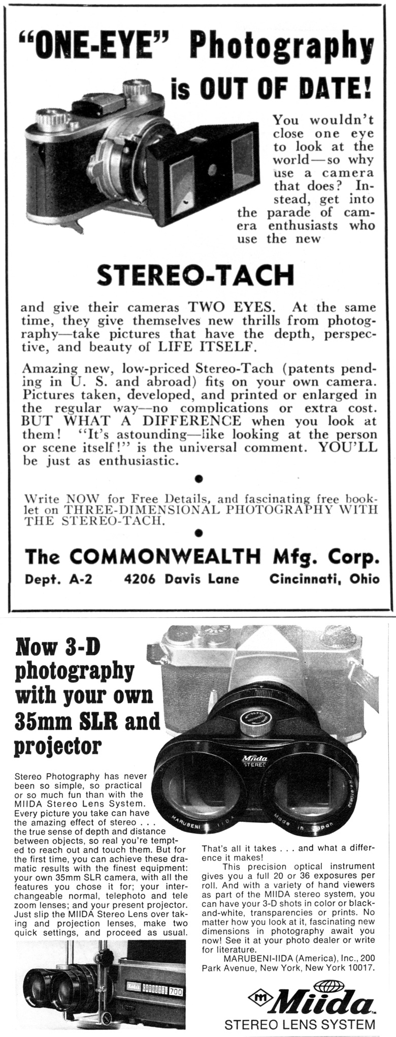 Some ideas hang on forever. This Stereo-Tach lens attachment from 1939 antedated the half-frame Stereo Realist by several years, but never caught on. Interesting idea—you screw this onto your lens and it splits the frame into two half-frames, each with a stereo pair courtesy of the mirrors that offset the point-of-view. Leica made an attachement for their cameras (I'll scan it when I find it again). You could either print the pair, cut them apart and mount them on a card to fit a turn-of-the-century Holmes-style viewer, or I believe there was a hand-held viewer, again using mirrors to split the pair for proper viewing. This Miidi advertisement is from 1971. I'm not 100% sure if the same attachment works on both the camera and the slide projector, or if you need two different ones. I am also assuming, as the copy doesn't say, that the lenses have polarizing filters set 90° apart so you can view the slides using polarizing glasses. I wouldn't mind having this system, it would be fun to try it out; but so far I haven't been able to find any of it for sale. |