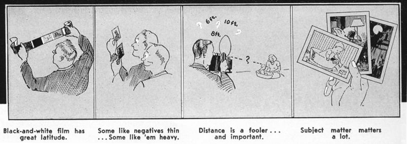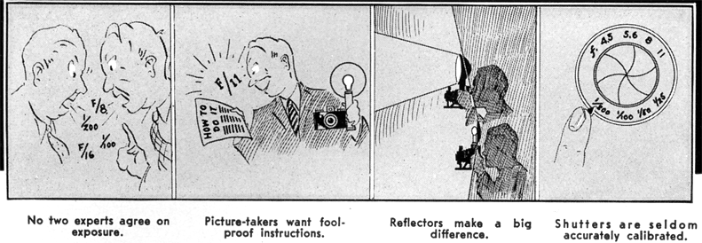 In a letter asking for information about flash photography, a Minicam reader demanded, "Are Exposure Tables Crazy?" He wanted to take some Kodachrome color shots using flash bulbs to get brilliant, sparkling illumination. The first thing he learned was that in color photography it is important to get exposures exactly right. The second thing—to his dismay—that there are many discrepancies and seeming inconsistencies in the exposure recommendations from various sources. In one case, one manufacturer recommends four times as much exposure as another. For example, the instruction leaflet packed with Kodachrome roll film advises use of ƒ/8 at 6 feet for Kodachrome "A" using one No. 11A Photoflash lamp. This is for open-shut exposure . . . opening the shutter, flashing the lamp, closing the shutter. Eastman ought to know the correct exposure. They make the film and run exposure tests. But the table printed by the General Electric Company for the same conditions recommends ƒ/16 . . . a difference of two full stops. G-E ought to know the correct exposure. They make the lamp and run exposure tests. Close reading of these two data sheets will reveal that Eastman's table is based on the use of "handy" reflectors of the two-for-twenty-cents cardboard kind. The G-E table is based on the use of "good" metal reflectors. A good metal reflector will put about four times as much light on the subject as a cardboard one, when identical lamps are used. There is your difference. Many other seeming contradictions and variables exist. All shutters do not give identical exposures when set for the same speed. All synchronizers do not take identically the same part of the flash. There are slight differences between films of the same speed rating, and between individual flash lamps of the same make. And there are great differences in individuals, too. One chronically overestimates the distance between his subject and his lamp. Another measures it carefully. Another underestimates the distance. Some estimate it correctly indoors, but go way off when estimating distances outdoors, especially at night. Some develop their negatives carefully in fresh solutions. Others are haphazard about development and run developing solutions nearly to the point of complete exhaustion. These small differences in equipment, in individual methods, and in subject matter, can add up to big differences in a resulting negative and print. Dark subject matter requires more exposure than medium or light subject matter . . . yet few but the experts consider and allow for this when making a flash picture. And finally, there is little agreement among photographers as to exactly what is a good negative. Some like 'em thin for projection printing, some like 'em heavy for contact printing . . . some like 'em in between. What can the individual do about it? How can he get good, consistent picture results that are better-than-average? He can reduce all of his personal differences to the least possible number, and he also can run a simple test to provide a basis for exact results. Such a test is especially valuable in color photography where an inaccurately-calibrated camera shutter is enough to throw transparencies off color. Make a series of pictures using one camera, synchronizer, reflector, film, and flash bulb. The recommendation of the photo dealer or manufacturer, can be followed in selecting the combination of equipment best suited to your purpose. Having decided, you will stick with these . . . retaining even the same shutter speed. The test shots should be made under good average conditions . . . that is, in a normal-sized living room, with medium colored walls and ceiling. The subject should be a person in medium-colored clothing (subject matter of which pictures are wanted anyway, can be used. Some of the shots will give good prints). The subject should be in the same position in all pictures . . . the camera should be in the same place . . . the lamp-to-subject distance should remain the same. The Lamp-To-Subject distance may be determined from any exposure table. Pick a distance which calls for a diaphragm opening half-way between wide open and fully stopped down. Then make a series of consecutive exposures . . . starting with the smallest stop opening, and making one picture at each opening. With Kodachrome, make these exposures at ½stop intervals, such as ƒ/5.6, ƒ/6.3, ƒ/8, etc. For B&W pictures, expose at 2-stop intervals, such as ƒ/4, ƒ/8, ƒ/16, etc. Now, the lamp-to-subject distance, multiplied by the diaphragm opening, will give you a guide number which can be used to remember exposure and get the same results under similar conditions. Suppose, for example, that your best negative resulted from a stop opening of ƒ/16 at 10 feet: 16 times 10 equals 160, your Flash Number. Dividing this number by any distance in feet will give the correct diaphragm opening for your particular camera, reflector and room conditions. At 20 feet, for example, dividing 160 by 20 gives 8 . . . use ƒ/8. Or the number divided by a preselected stop opening gives the correct lamp-to-subject distance. For ƒ/ll ... 160 divided by 11 equals 14.5 . . . use a distance of 14½ feet. In B&W photography, the latitude of the film is perfectly adequate to take care of slight variations in conditions. In color work, where absolutely perfect exposure is desired, it is easy to adjust for these slight variations. Most flash pictures are made with the synchronizer and flash bulb reflector fastened right to the camera. This means that the lamp-to-subject distance and the camera-to-subject distance are the same. The lamp-to-subject distance is then often determined by what the picture taker wants to include in the scene. He may have to back up to thirty feet to get it all in. Or, he may come in as close as four feet to get a big image. To allow for this variable, one good procedure is to frame the subject as desired in the view finder and then focus. When the 