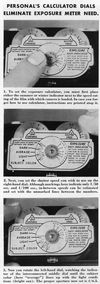 There are a few other important accessories. Two closeup attachments ($9.75 a set) allow you to focus the Personal camera as close as 24 or 36 in. The attachments include parallax correcting prisms for the viewfinder.