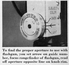 on your subject, the dial on the flashgun measures the subject distance and divides it into the flashbulb guide number.