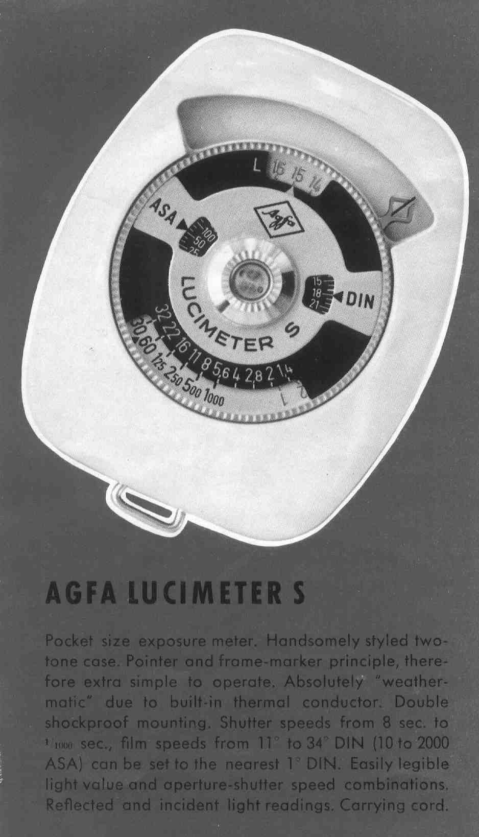 ![]() ![]() Maker: Agfa Model: Lucimeter S Circa: 1958 Cell type: Selenium Measure type: Reflecting / Averaging |