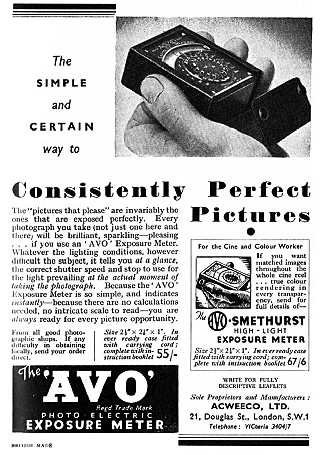 Philip Smethurst was an English photographer/scientist who started Smethurst High-Light, Ltd. and likely designed this unit (he has a couple of early patents for exposure meters, including an incident) and got ACWEECO to manufacture it. No idea how well any of this worked out, as this is the only Smethurst-branded meter I've seen. There are a couple other AVO meters which bear a strong (but not exact) resemblance to it, but that's it. Very likely ACWEECO changed over to military manufacturing when World War II broke out in 1939, and by the time it was over, they were uninterested in getting back into the photographic market. According to Dunn & Wakefield in their Exposure Manual, this is the first incident light meter sold anywhere, and thus historically significant. This is an incident meter and the instruction manual goes to pains to explain how to measure the ambient light to get a useful reading. The dial has four positions (A, B, C, and D—hard to see on this photo) based on different conditions (bright sun, open shade, etc). But the most unusual feature is the lack of exposure index. Instead they give a "factor" for various films, and you set the pointer on the center dial to the proper factor, then rotate the whole dial until the pointer matches the meter needle position, and then you read your shutter/aperture combinations. I was very fortunate: mine still works, and it came with the box, the case, the manual and a packet of stickers you're supposed to use when you send your film to the lab, telling them not to use "compensating" development. If you're interested in some subsequent AVO meters, check out this page from a very good Weston meter site. |