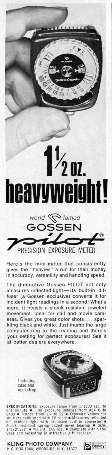 ![]() ![]() Maker: Gossen Model: Pilot Circa: 1960 Price (new): $15.95 Cell type: Selenium Measure type: Reflecting / Averaging and 2D incident |