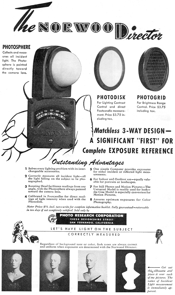 I was amazed—I never thought I'd find the original version of the Norwood Director. This is known among collectors as Model A, the predecessor of the long-lived Model B and sister to various Spectras for the next thirty years. To the best of my knowledge, Photo Research only sold this for about a year. Then Norwood went to American Bolex and got a makeover, and PR rechristened it the Spectra. The only big difference between this and the later Spectras (like the Professional) was the latter had perforated slides that were calibrated to match up with a secondary ƒ/stop scale on the face. The slides were set for 1/50th shutter speed and various exposure indices, so you could pick the appropriate one and direct-read your meter. This one has a slide for bright light, but that's it. But to show how little difference there is—the photosphere and the slides on this meter both fit my Spectra Combi-500, despite about 20-years difference in age and the inclusion of CdS technology in the latter. It wasn't until the 1970s that they seriously redesigned this meter. |