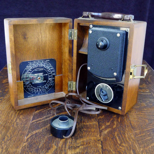 I don't know anything about Photovolt except that a) they're still in business and b) they seem to have appeared after World War II with a variety of lab-test equipment, particularly photo densitometers. My guess is that Hickok spun-off the unit that made this equipment or sold the rights to manufacture it, and Photovolt came to be. The first (and only) evidence of existance I've found for this meter is from a 1948 issue of Minicam Photography, where it's listed as the 200A model; it's obviously the same unit. I have no idea when my "M" revision came out. This is one of the nicest meters I've come across in terms of effort of workmanship. It's a wooden box that's very nicely manufactured—doesn't look cheap at all. It's got four rubber feet on the bottom and four on the back so it can be stood upright or laid back for use. The cell has its own little cup to hold it in the side section where the cord goes. The handle is hard plastic, like on luggage, so it hasn't torn off the way more handsome leather handles would have done.
