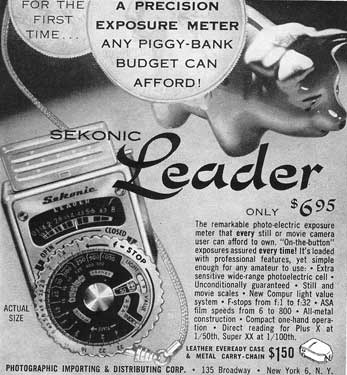 ![]() ![]() Maker: Sekonic Model: L-VI "Leader" Circa: 1954 Price (new): $7.95 Cell type: Selenium Measure type: reflecting / averaging |