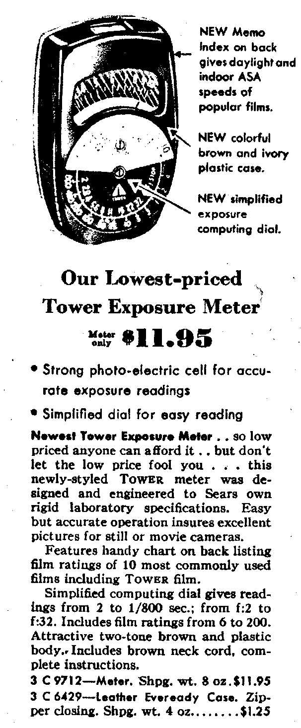 ![]() Maker: Tower (Sears, Roebuck) Model: Exposure Meter (no model #) Circa: 1952 Price (new): $10.95 Cell Type: Selenium Measure type: Reflecting/Averaging |
