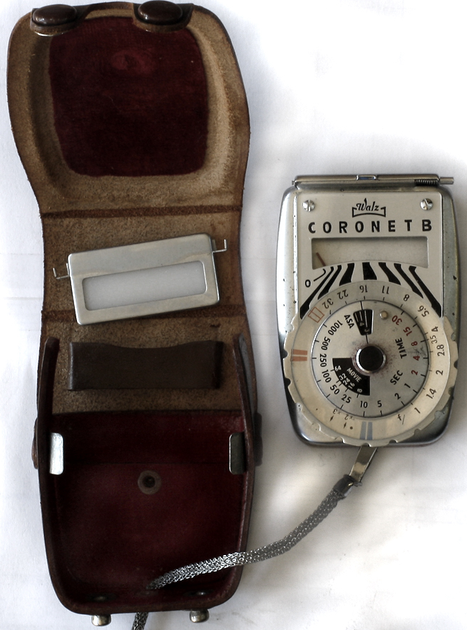 Walz began as the export arm of Okada Optical in Japan, but eventually became simply Walz (at least in the US). They made a few cameras, but I mostly know them for their accessories: namely filters and the odd light meter or two. It was Walz, for instance, which ended up with the Norwood Super Director. This is a Coronet B—I haven't yet seen an A model. Nothing special about it; it's like many other meters that flowed out of Japan at the time, in particular the Sekonic L-6 and Showa-Koden's Unittic IX (not in my collection). My guess is that this is a tweaked L-6. There are two Coronet B's. This silver one and a later black-cased one, which had a slightly different calculator dial. Acquired this the old-fashioned way—when I purchased a movie camera "outfit" from a thrift store.. |