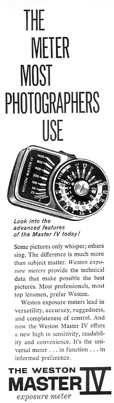 ![]() ![]() Maker: Sangamo-Weston Model: Master IV (Model 745) Circa: 1960 - 1963 Price (new): $30 Cell type: Selenium Measure type: Reflecting/Averaging (3D incident available as accessory) Modern Photography Review: July 1960 |