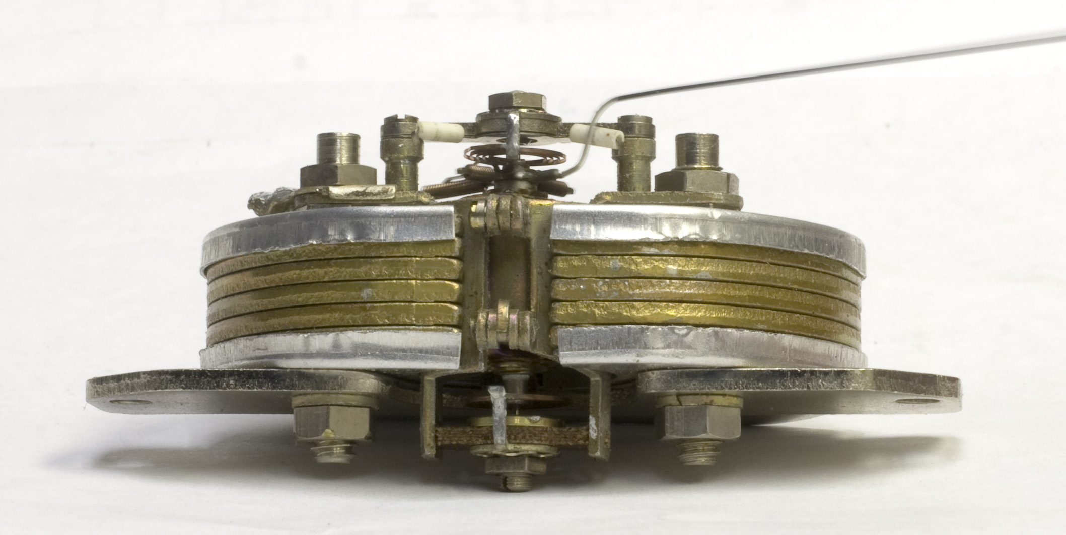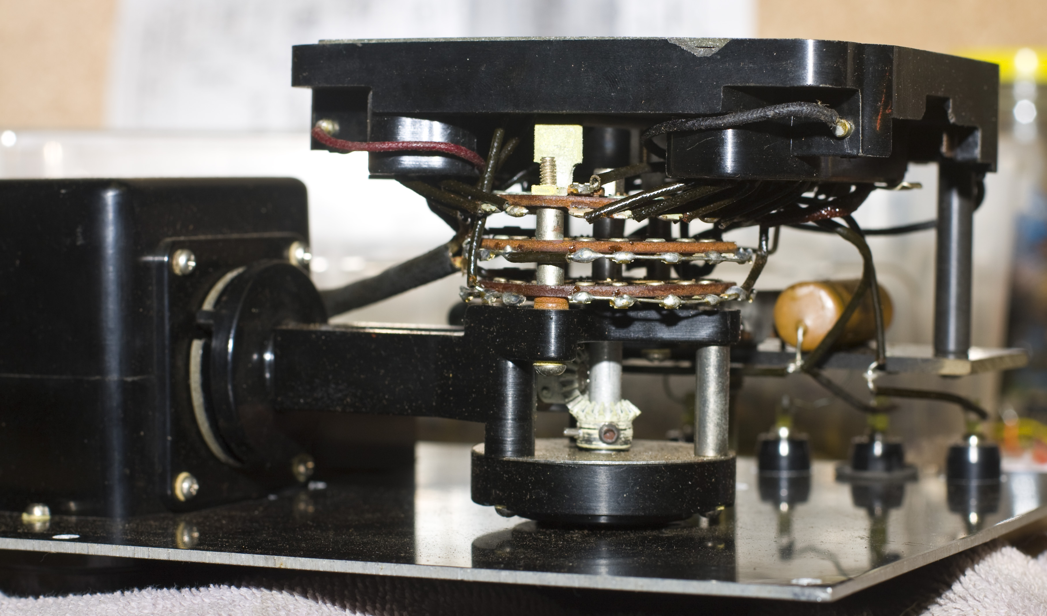 Lower left; detail of the selector switch (knob down). On the left you can see the mechanical rotator that connect to the meter drum, so that as you rotate the range switch, it turns the drum accordingly.