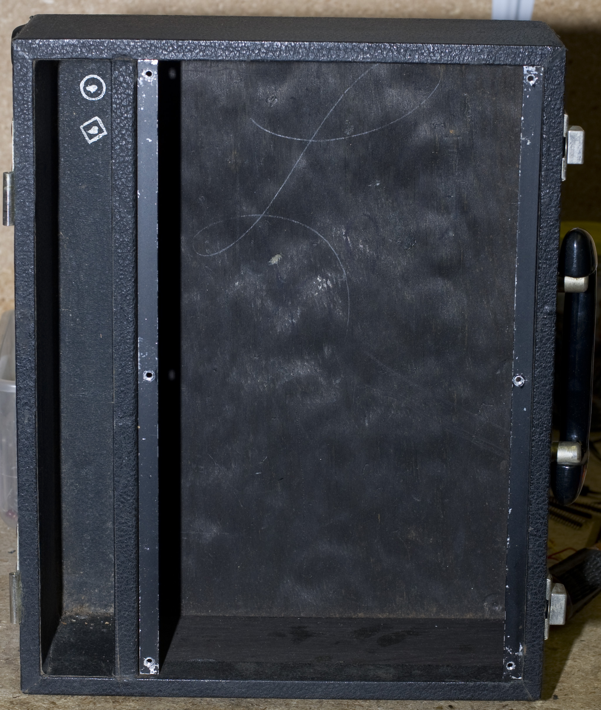 The case with the works removed. All you have to do is take six screws out of the front panel and it lifts right out. The front cover has sliding pin hinges so it comes off easily too.