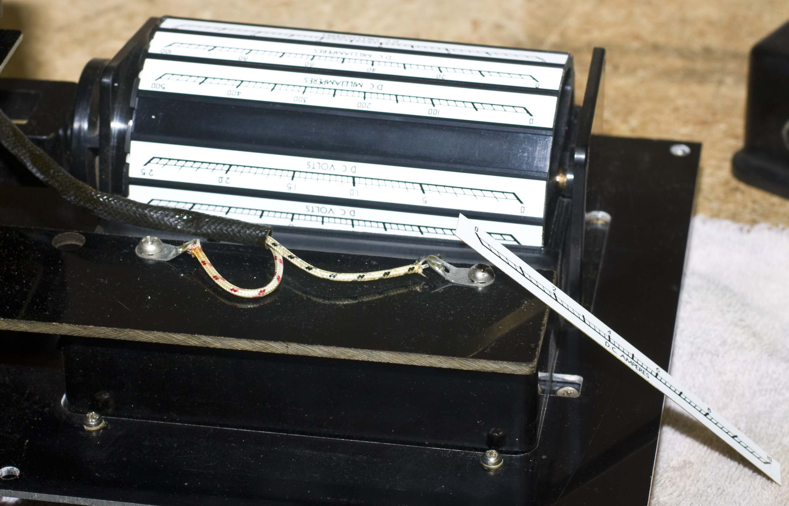 When I received the meter, one of the scale faces had come unglued and was floating around. If you click on the image (right) you'll see a larger version and it's more apparent. So were also something rolling around loose in the cabinet, so I had to open it up to deal with both those things.