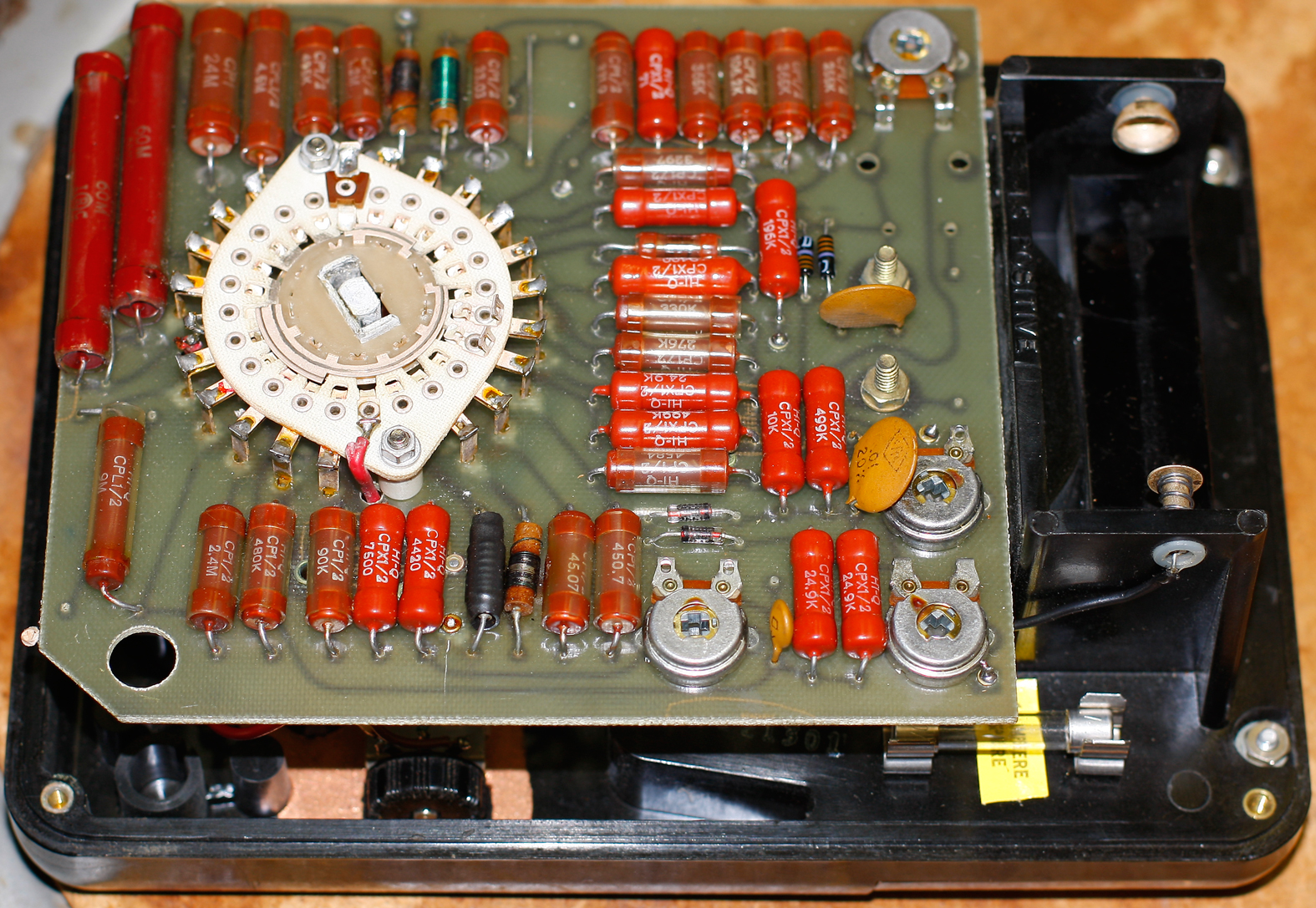 This meter uses a 1µA meter movement. According to Fred Scoles over on AntiqueRadioForum, the high sensitivity meant that they couldn't use the bakelite turret because it attracted too much static, and thus they went with a special PC board instead.