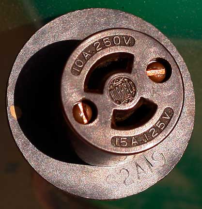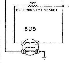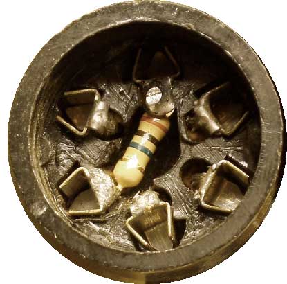 The Old Man had directed my attention to the 6U5 "magic eye" portion of the schematic to the resistor (R22 on the diagram to the left), which he says is notorious for failing. It's a 1MΩ ½ watt resistor that's located within the eye-tube socket itself. If you look inside the socket, there's a flat facia plate that covers the pin sockets; there's a key and a notch so it only goes one way, which is necessary because two of the pins are physically larger (the heaters), and it provides protection so you don't inadvertantly plug the tube in incorrectly. Anyway if you lift this plate out (mouse over the image to the right), it exposes that little 1M resistor which is soldered between Pins 2 and 4. Happily, 1MΩ ½ watt resistors are cheap and easy to find, unlike the 6U5 itself (Tube Depot wants around $60 for it; Tube World has some for $45).