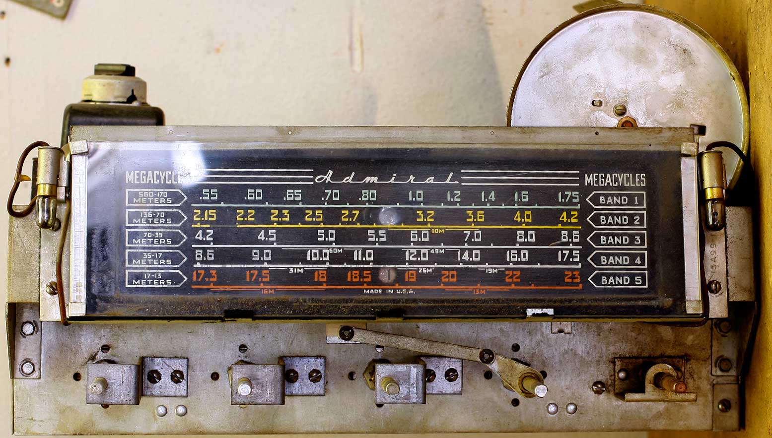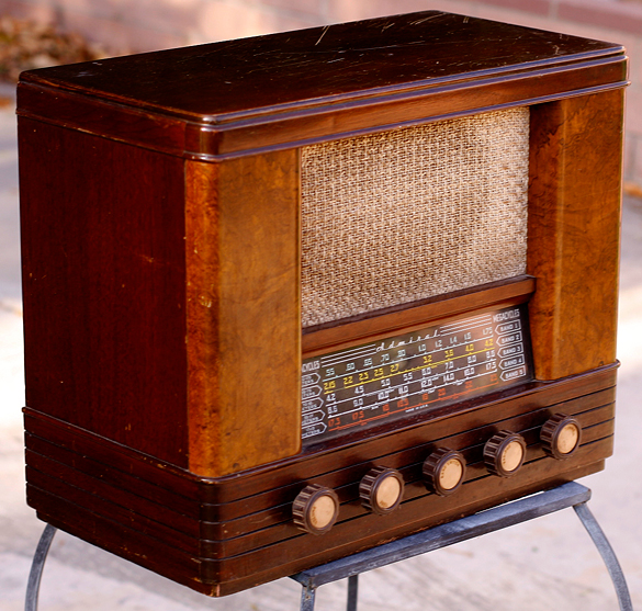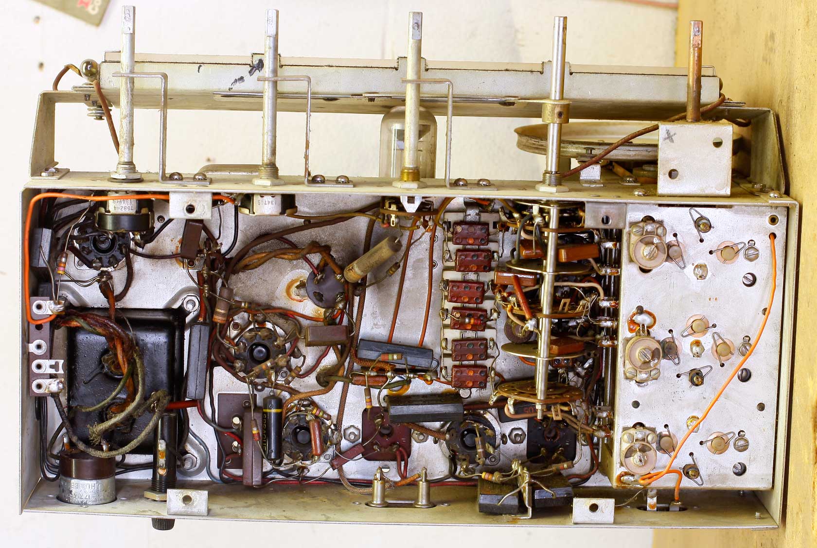 Almost everything I know about this comes from the Radiophile website. They describe it as an "odd hybrid" of consumer radio and communication rig, and I agree. It's big (19x15x9), it's got the two-tone wooden cabinet with what I believe is burl-walnut on the sides, five bands on a slide-rule dial, so it turns from 540kHz continuously (except for a small gap around 2MHz) up to 23MHz. Yet it's not a real communications radio: there's no bandspread or way to handle code; more importantly, inside it's an All-American six with a transformer (whereas most communications rigs have a lot more tubes). A look at the schematic on Nostalgair shows that it's surprisingly uncomplicated.