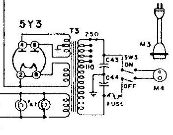 I didn't want to re-cap the whole thing up-front just in case I introduced more problems, so I decided to try and do things in increments, so I wanted to see if it ran. As this is a transformer supplied radio (as opposed to a transformerless rig where the tube heaters are wired in series), I pulled the 5Y3 rectifier and turned it on to see if the radio would light. Removing the 5Y3 allows power to go to the tube heaters but removes the rectified high-voltage supply to the rest of the system. I looked and listened for shorts, smoke, pops and any other nasty surprises but didn't find anything. Except that both dial lamps were burned out.