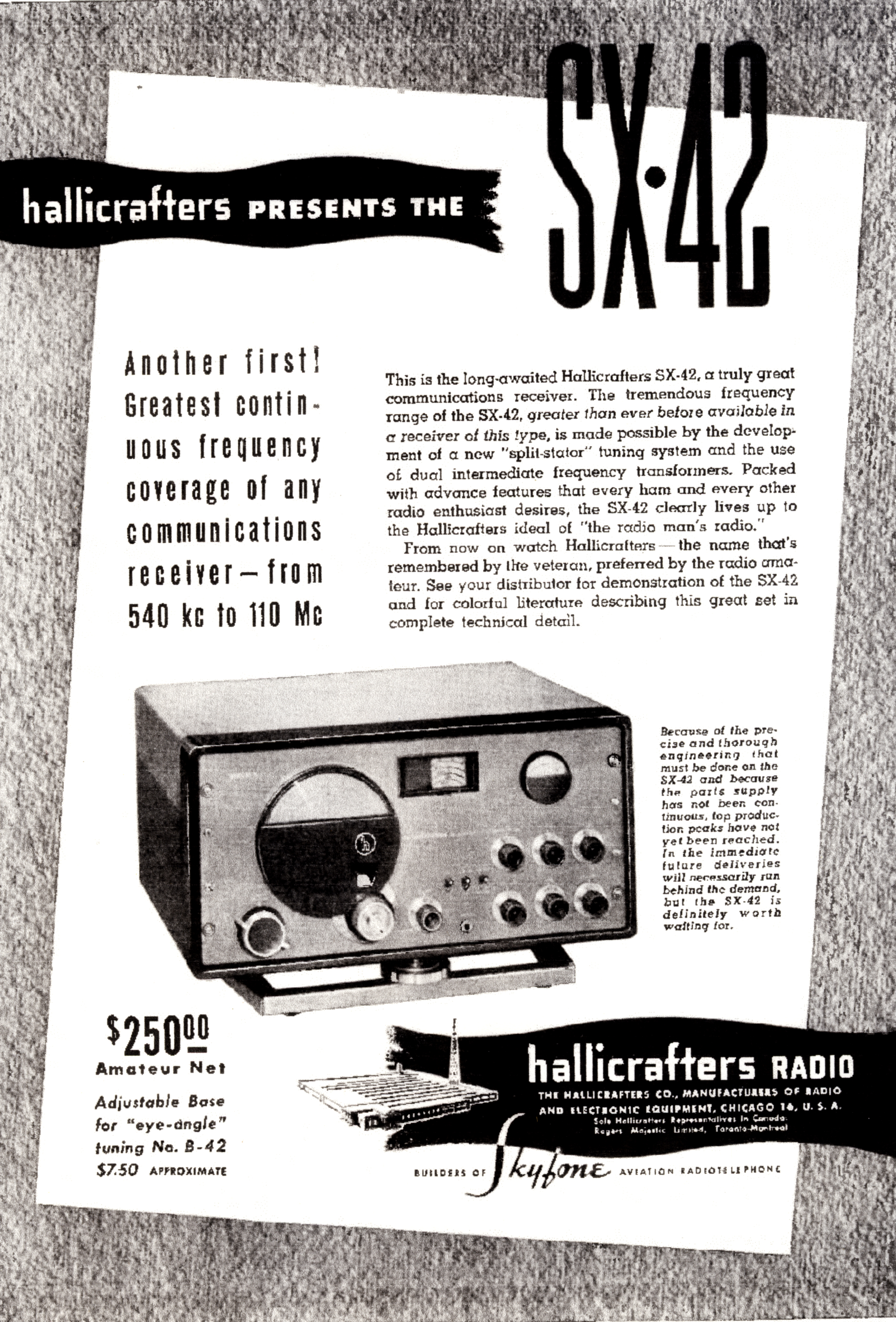 A guy on eBay is selling what he claims is an SX-42 "expanded" manual (operator's manual, service bulletin, clean photos, an 11x17 schematic, and stuff from Ryders manuals). He says it's clean and easy to read. It was $10 and free shipping so I went for it. I think I have all of it already but my copies vary from nice (the Photofact) to marginal (some Hallicrafters docs) to virtually illegible (other Halli docs).