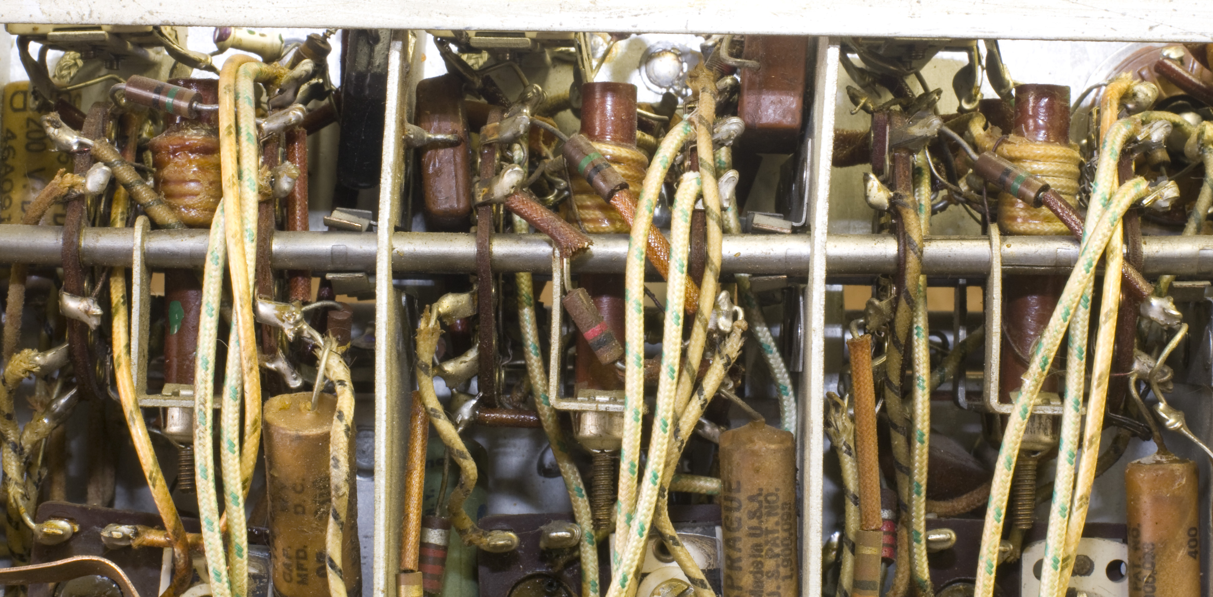 The most prominent bit of hotwiring was a jumper wire connecting the B+ voltage supply of the first RF amplifier tube to the B+ supply of the second RF tube. (Both tubes are type 6AG5, by the way.)