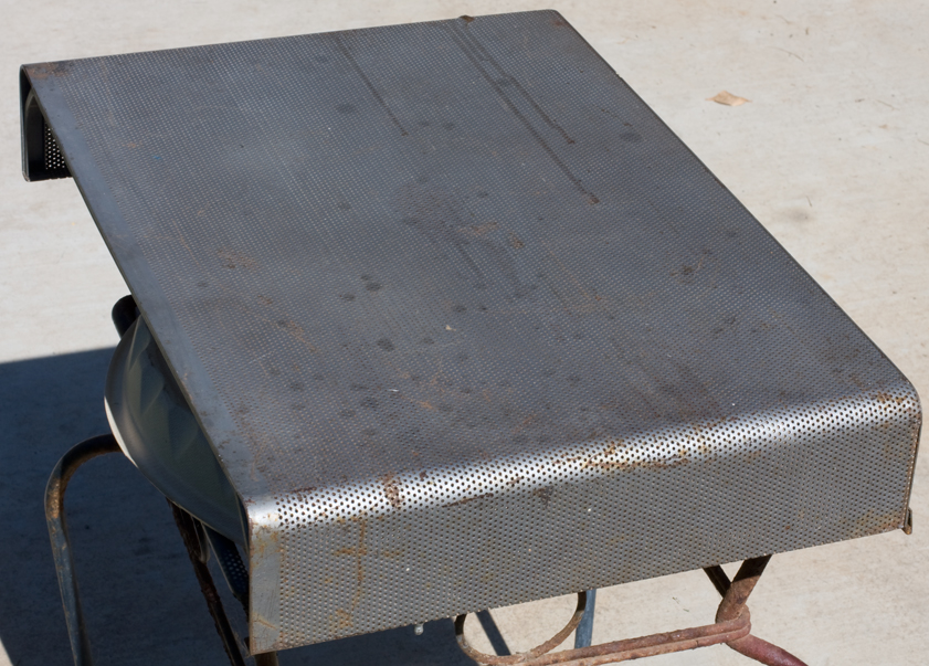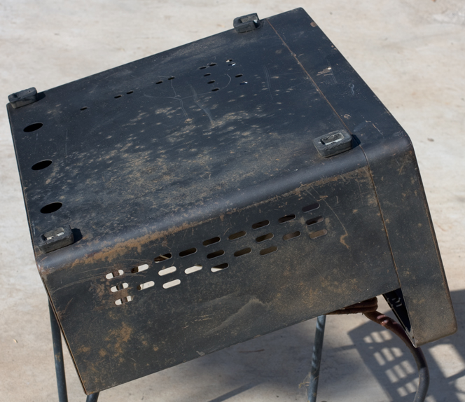 I bought a couple cans of paint for the cabinet: Krylon Rustoleum Hammertone Black for the base and Metallic for the top. The cabinet bottom was just black (or perhaps charcoal gray) but I thought a krinkle-finish would look good on it. Here they are before paint: I went over them with some 0000 steel wool, but didn't really have to do a lot. There's some light rust but nothing really nasty.