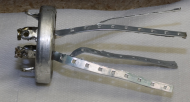 The problem is still that I can't solder to the internal strips, which I assume are aluminum or some other metal that doesn't play well with solder. I'd already given up on the idea of grounding it, so I bored a hole through the phenolic base to run a ground wire through and solder to the outer lug. In the meantime, one of the internal strips broke off at the base, so I bored a wire through that so I could solder to the lug. I still tried to hard-wiring on the other three, but it's a disaster and looks like a tinker-toy project built by a man wearing boxing gloves. So screw it: I'm going to cut all the internal strips off flush, bore holes through the base, and run the leads through and solder to the outer lugs. Purists who are offended can kiss it.