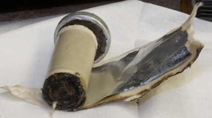Here's what it looked like inside. A little bit of tar (?) on the inside, but not nearly what I was bracing for. There's a rubber band holding the dielectric backing. Take that off, and it unwinds as a long roll of foil and cloth.