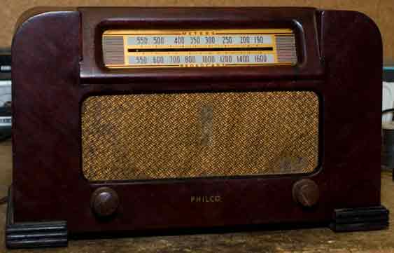 My grandfather's radio. This came out in 1942: Philco had the sensible idea of assigning model numbers based on the year of production, so for many years, the first two digits tell you when the radio came out. If they carried the radio over another model year, they'd change the model name to reflect it.