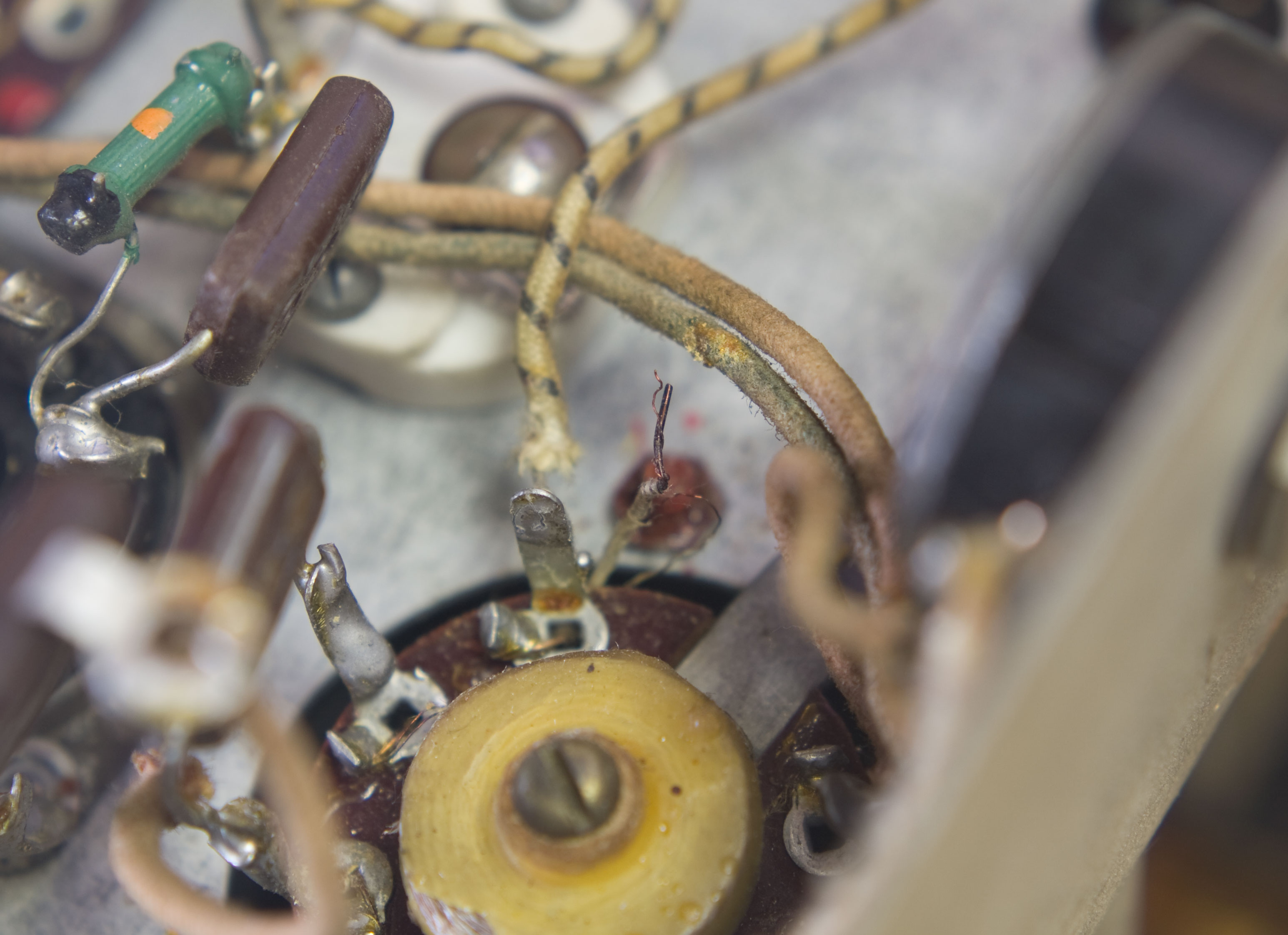 Next step: the wire. After a conference with poring over the schematic and a hard, hard look at the chassis, I decided that the "broken wire" is really the gimmick capacitor.