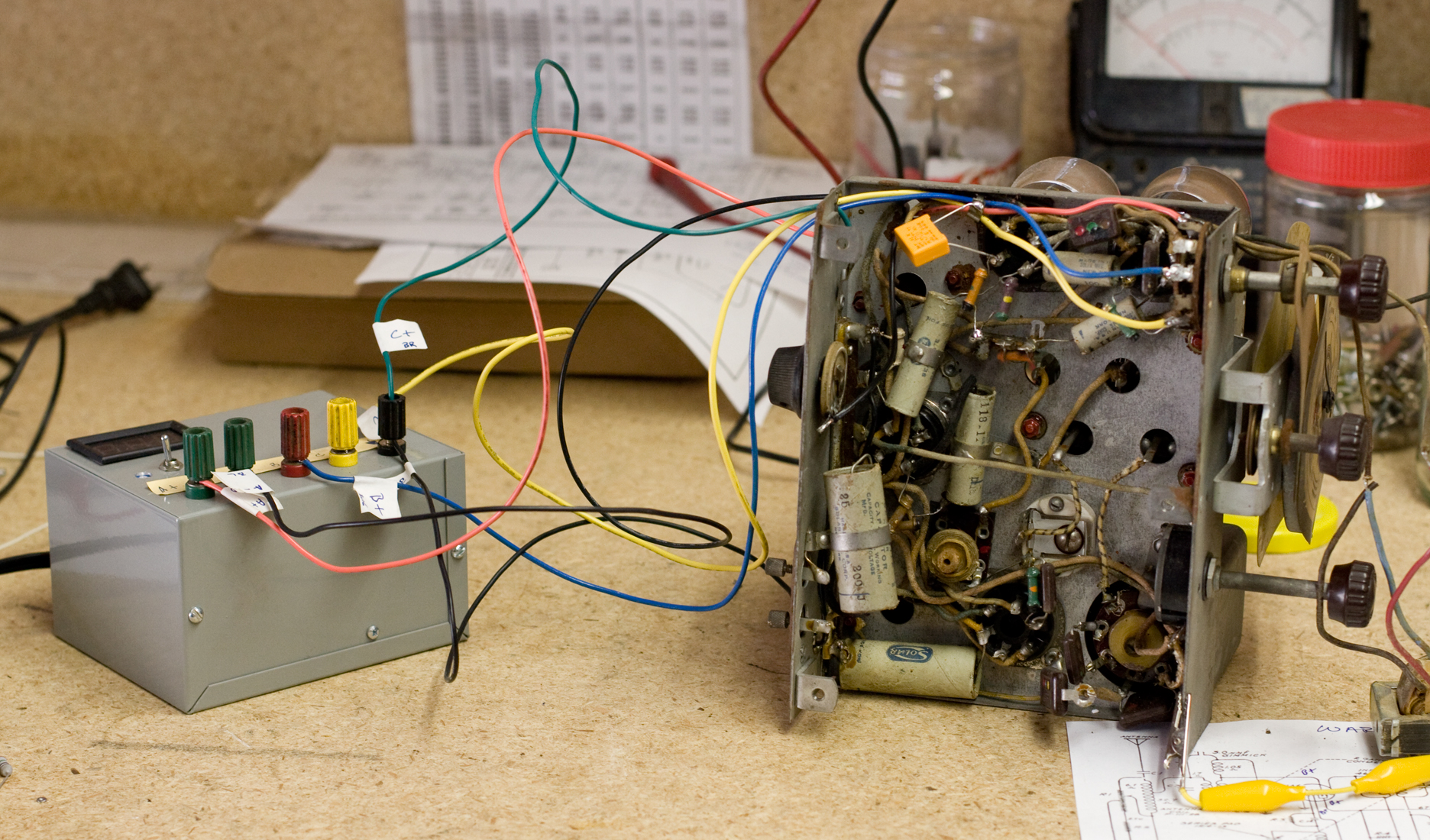 Tuesday Afternoon or really evening. A consult with The Old Man, who suggested cleaning and tightening the pin-contacts (for lack of the proper name) of the sockets, because the old, low-voltage tubes were known for making intermittant contact; at 2 volts and little current, a little oxide buildup or an iffy contact would shut them down. So I hosed them down with contact cleaner, pinched them a little from underneath with the long-nose pliers, and plugged the tubes back in. And NOISE!