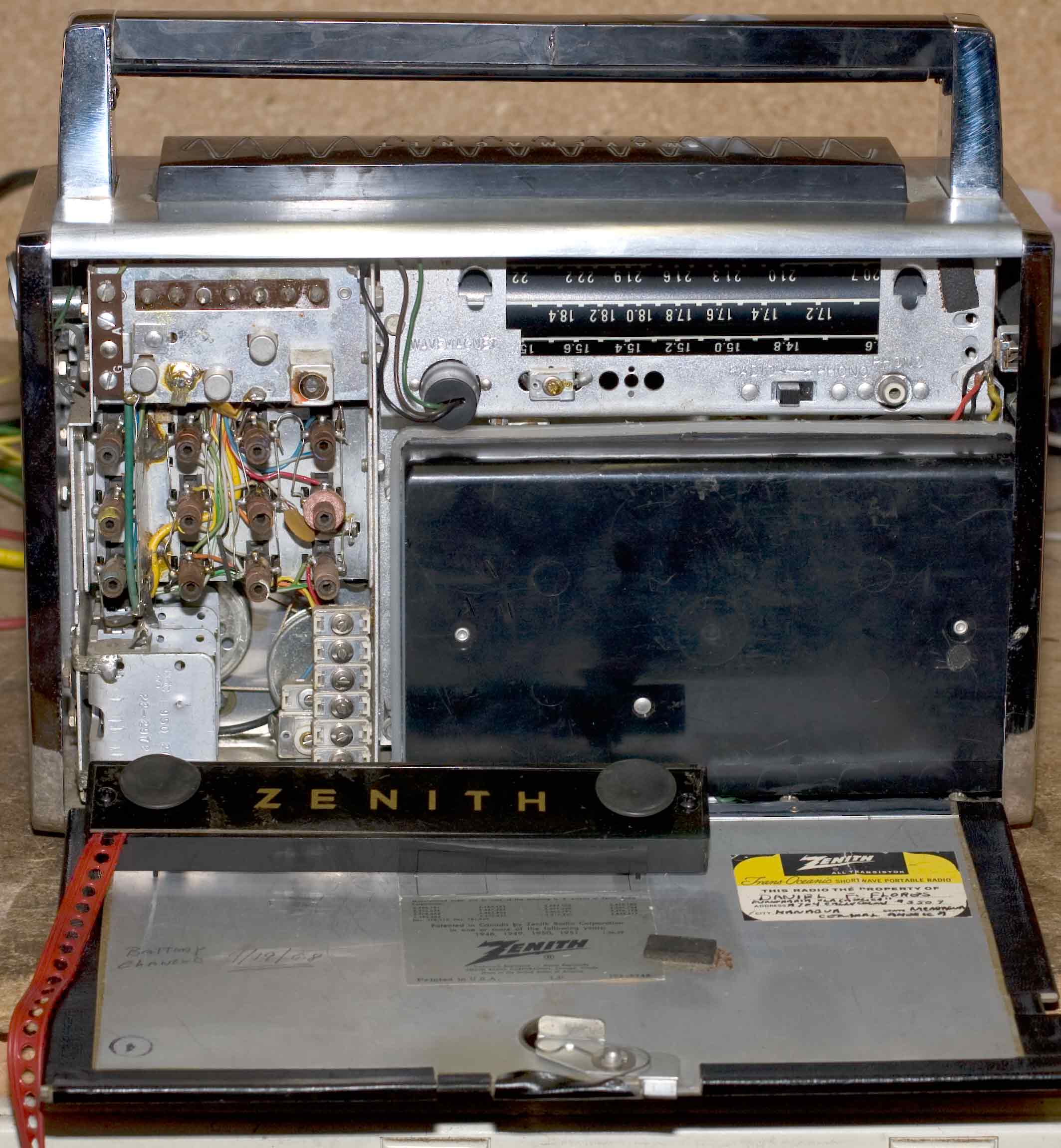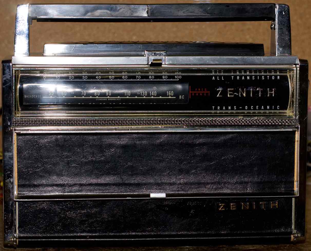 Some background first. Zenith made its first solid-state T-O, this Royal 1000, in 1957; it ran concurrently with its last tube-version, the H500 Super Trans-Oceanic. The next one from the early 60s is the Royal 3000. And finally in the 70s there was the Royal 7000 and the R-7000, and that was it. They're desirable in that ascending order, with the R-7000-2 variant being the most pricey (typically a couple hundred dollars). There's a ton of stuff about these elsewhere on the net, so I'll leave it at that.