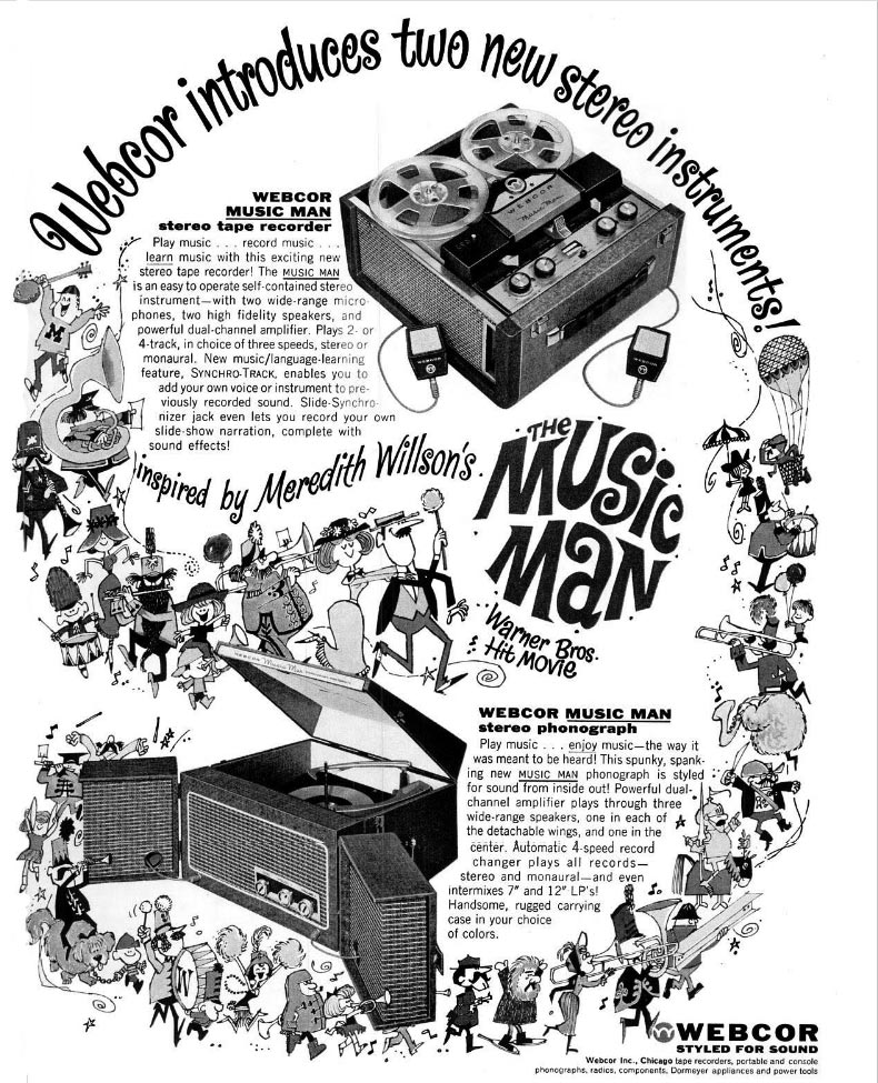 There's an interesting short article by George Simkowski on a site called Talentzoo.com. Simkowski was Webcor's Advertising Manager during the Haffa years, and tells of two product tie-ins. The first was providing a Regent Coronet tape machine for the movie Bachelor in Paradise, one of the few good movies Bob Hope made in the 1960s. The other was in 1962, when Simkowski concocted a big promotion with the film version of The Music Man. Along with a big contest for children to show off their musical skills, Webcor's model 2356 tape recorder and model 1356 phonograph were each named "the Music Man." Pretty nice ones, too.