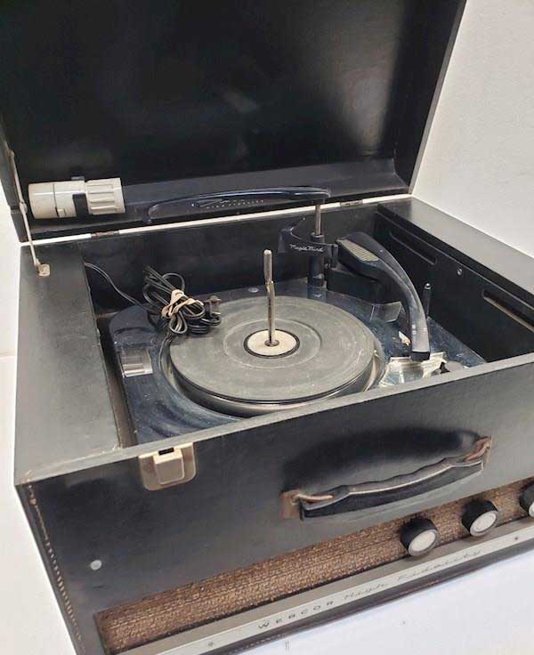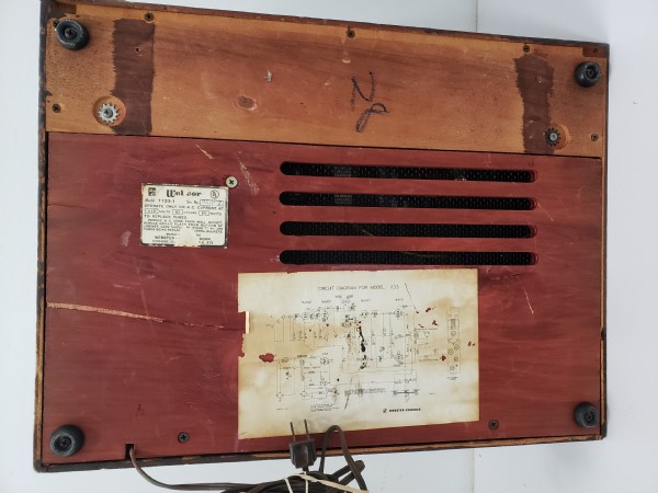 Portable | Two speakers, one detachable; built-in 45-RPM adapter. Manual record player. Similar to Model 1113 (also with manual record player), Models 1152 and 1252 (automatic changer). 2-tube. 25W. SAMS Photofact 607, Folder 11 (electronics); Photofact 447, Foler 13 or Webcor 184 (changer).. |
